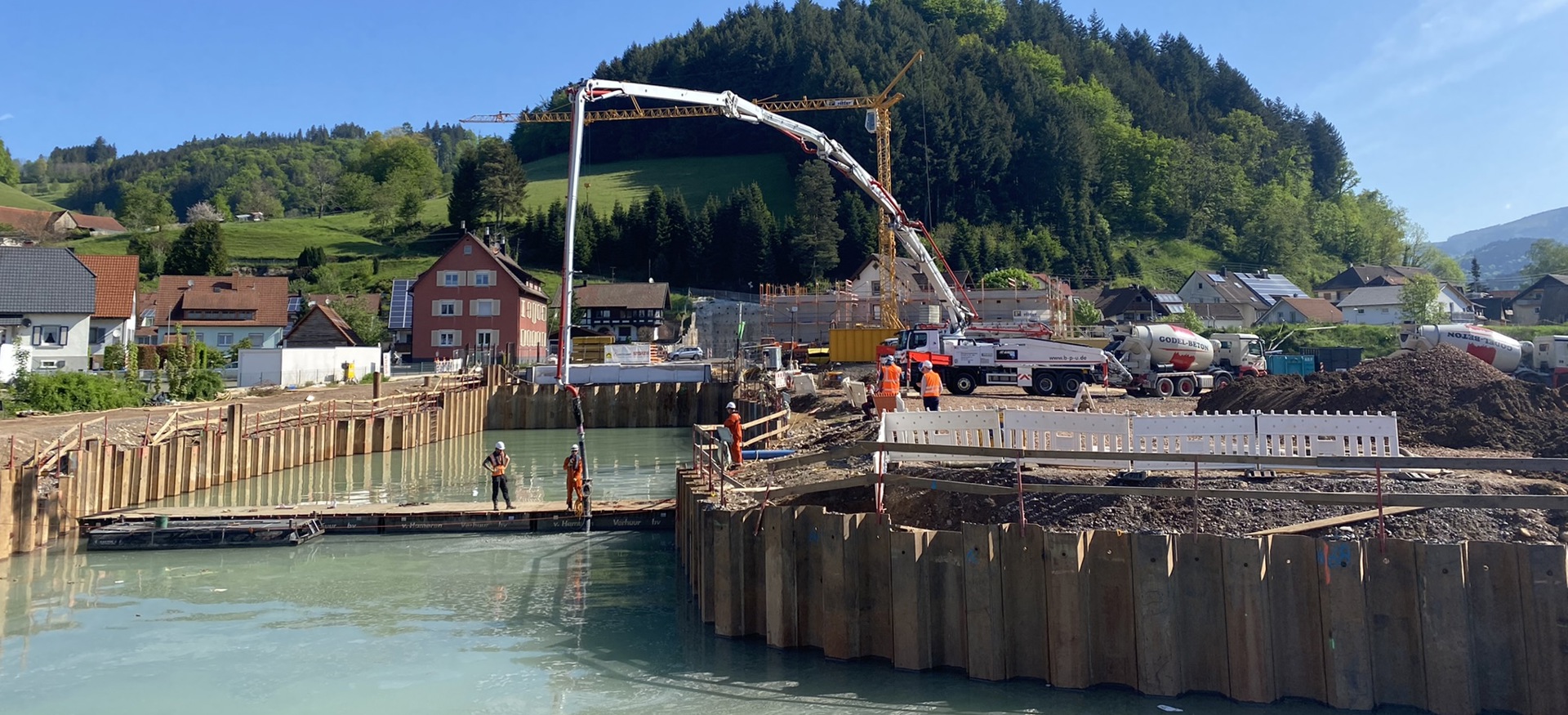 Voor de bouw van de trogconstructie werd een bouwputbescherming met damwanden aangelegd. De ontgraving van ca. 7.000m³ werd onder water uitgevoerd met een speciale kabelgraafmachine van 120t, die werd begeleid door duikers. Daarna volgde een dertig uur durend betonstorten van de onderwaterbetonbasis (2000m3 beton), wat zelfs voor de ervaren duikers en het projectteam geen alledaagse uitdaging was. Afgezien van de storingen in verband met de corona, stelde de geopolitieke situatie dit project voor aanzienlijke hindernissen.